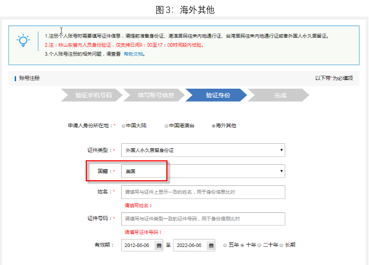 4.在身份验证环节中,申请人身份所在地会涉及到三种,分别是中国大陆、中国港澳台、海外其他,申请人身份所在地选择中国大陆,可以通过身份证进行身份验证;申请人身份所在地选择中国港澳台,可以通过“港澳居民来往内地通行证”和“台湾居民来往大陆通行证”进行身份验证;申请人身份所在地在海外其他,可以通过“外国人永久居留身份证”进行身份验证。